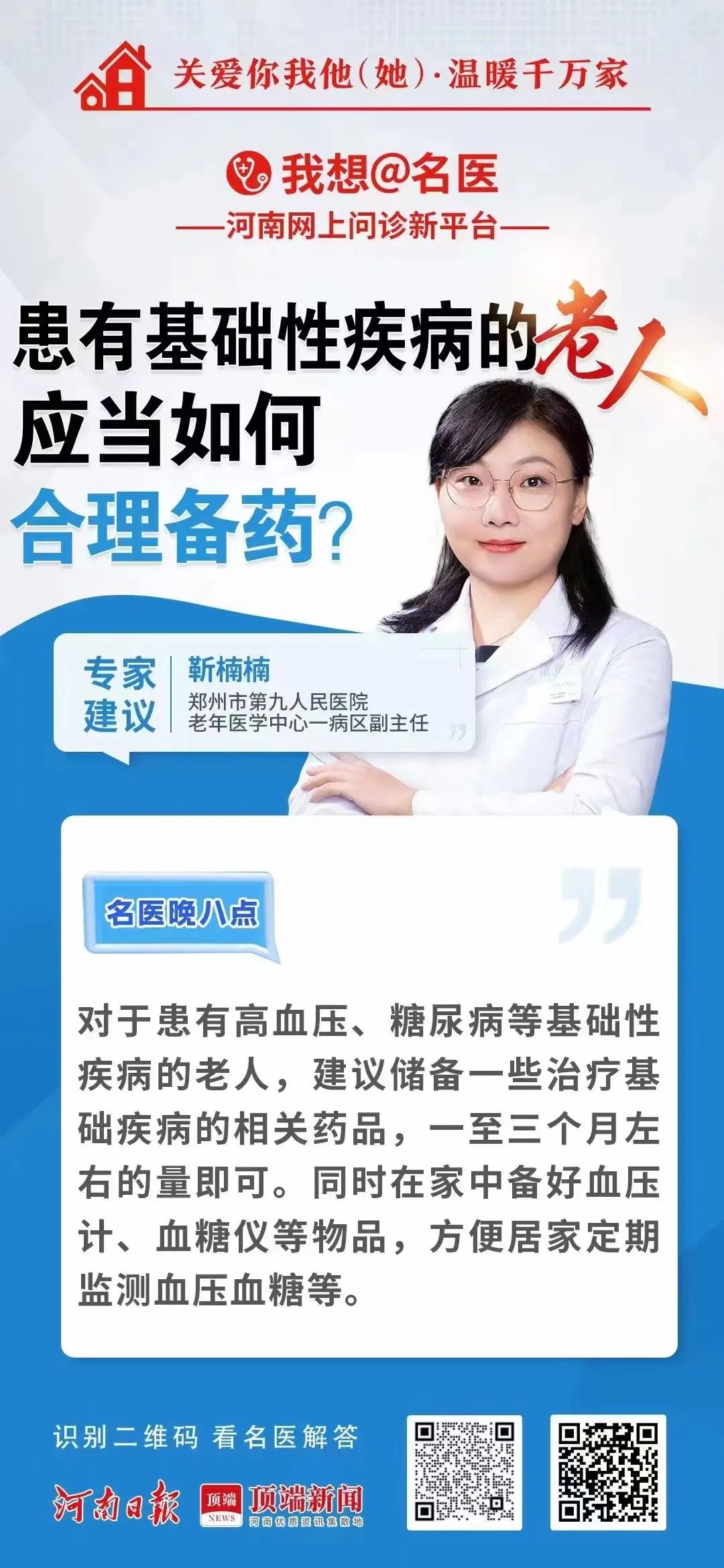 居家问诊 一键@名医 患有基础性疾病的老人应当如何合理备药?识别二维码看名医郑州市第九人民医院老年病专家靳楠楠副主任医师为你解答: