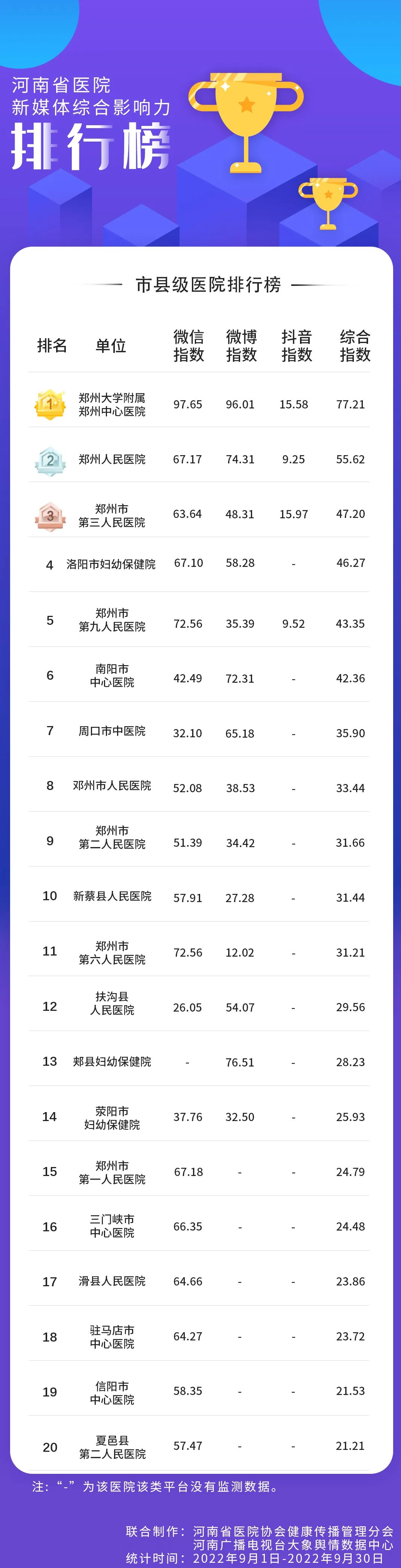 河南省医院协会文化专委会 新媒体综合影响力排行榜 九、十月榜单新鲜出炉。 郑州市第九人民医院 新媒体综合影响力 以强劲势头入围10强排行榜