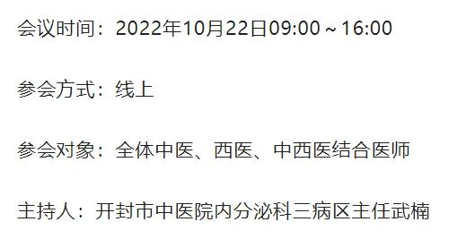 欢迎您参加2022年10月22日由开封市中医院举办的省级继续教育项目:“纯中药治疗2型糖尿病及其并发症临床应用新进展培训班”,本次培训班旨在加强基层内分泌、糖尿病专业和全科医学医务人员对纯中药治疗2型糖尿病的认识,规范纯中药治疗2型糖尿病及其慢性并发症的诊疗方法,大咖云集,内容丰富,观点独特,纵论纯中药治疗经验。