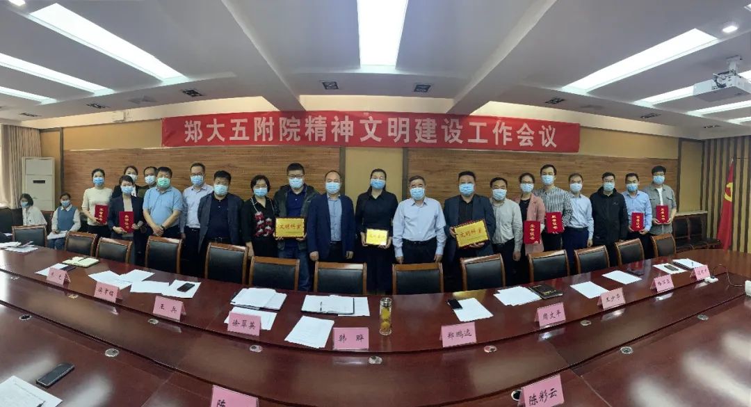 2022年4月11日,郑州大学五附院召开2022年精神文明建设工作会议,院领导韩晔、郑鹏远、徐翠英、周文平、王兵、傅聿铭、杨怀玉、朱光、汤有才出席会议,各党总支书记、各职能科室负责人和2021年精神文明建设工作先进代表参加会议。会议由党委副书记、工会主席徐翠英主持。